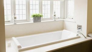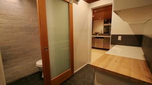 This apartment with nice shades of blue and a beautiful bathroom will help you to relax after work.